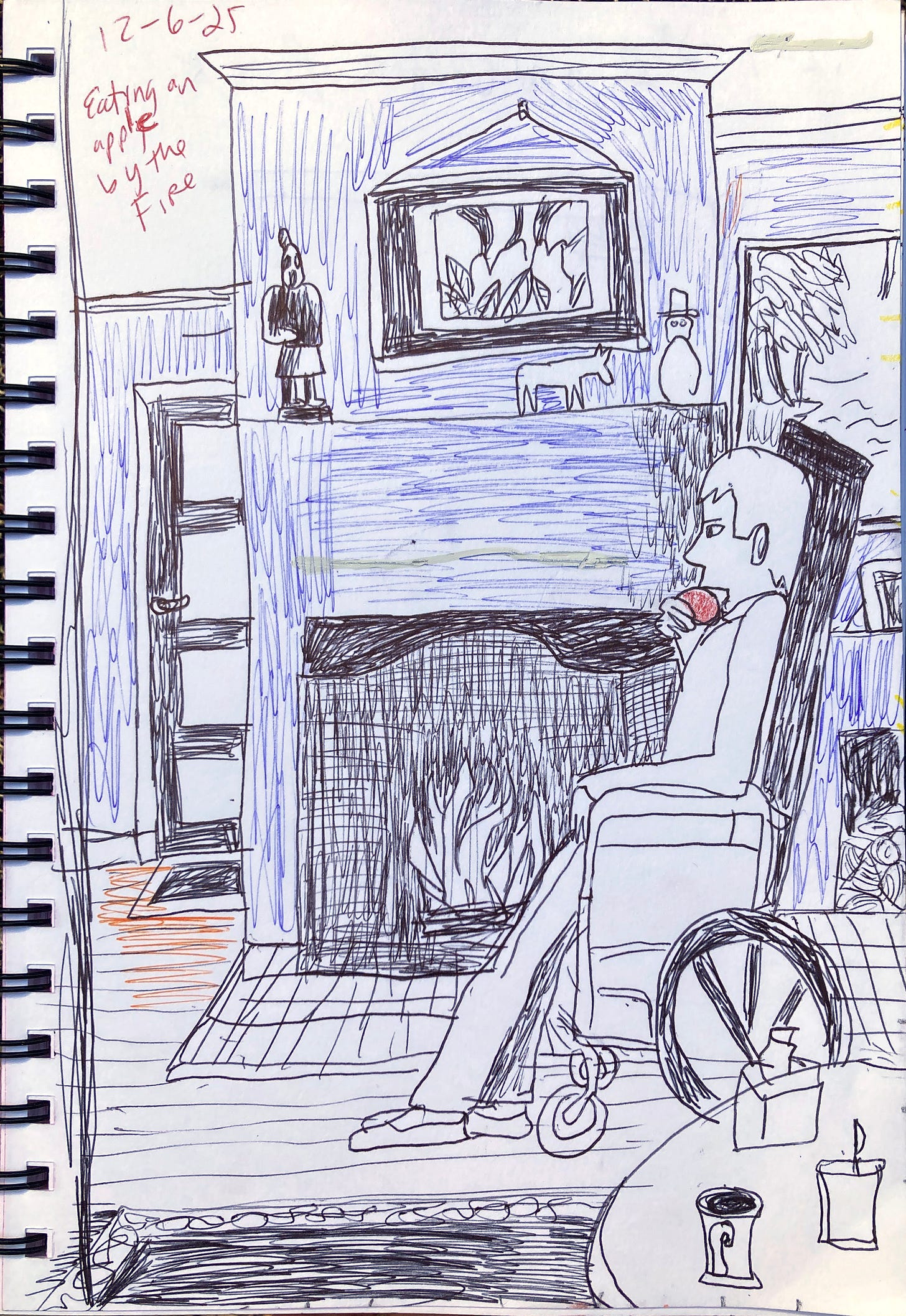 Maybe I will try to use my sketchbook for more drawing from life. As anyone who draws, knows, there is nothing like it for finding the self in the world. Feeling the self in the world. Feeling the world in the self. Moving the center of the self to the world. What is the world? What is the self? There is a drawing. Here is a drawing. Whistler’s Mother reference purely coincidental. Or not. Who knows.